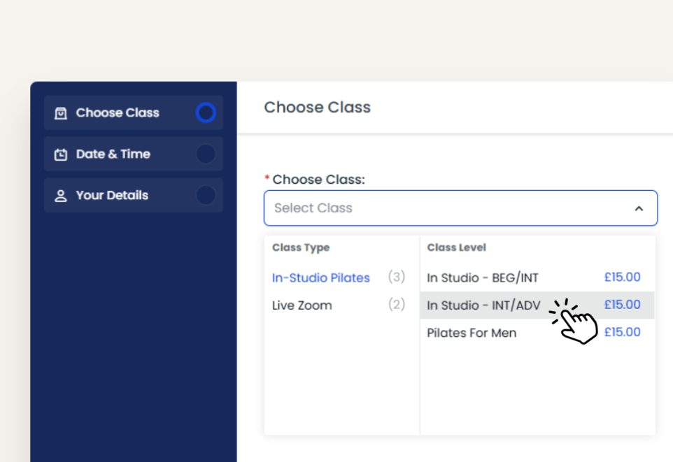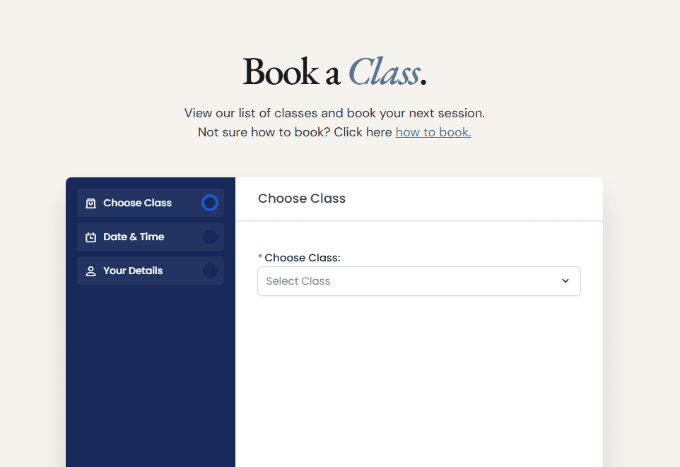 You can access the booking page from anywhere on our website. Just look for the ‘Book a Class’ option.