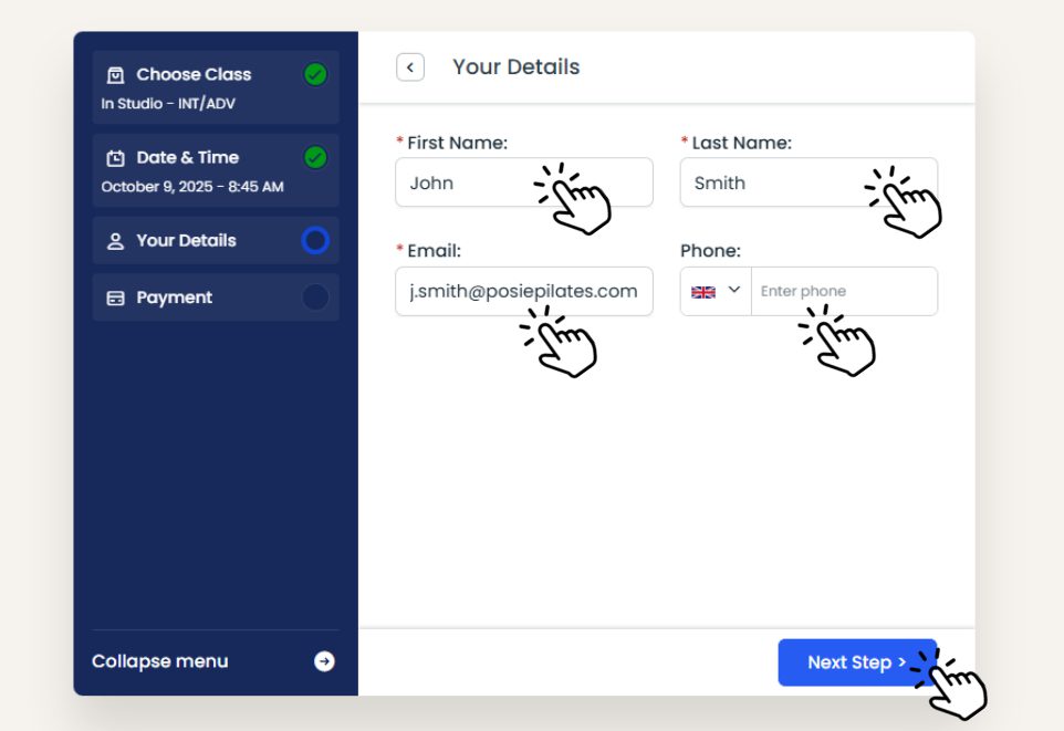 Enter your details. Be sure to use the same details each time you book to avoid any confusions. Enter your:
