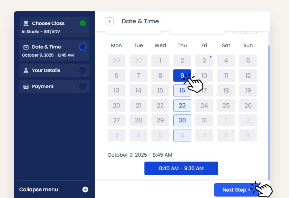 Choose your date for the class. You can book in advance. Choose your date and time carefully to avoid any confusions.